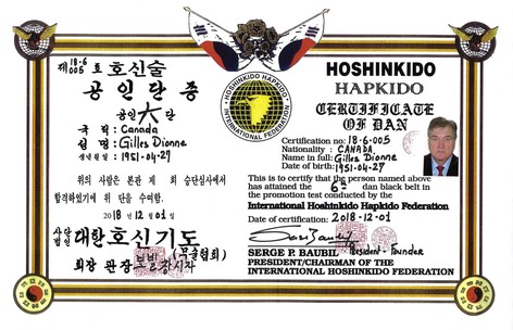 C’est en 1996 qu’il découvrit l’hoshinkido hapkido à la suite d’un séminaire d’autodéfense dispensé par le Grand Maître Serge Baubil, fondateur du hoshinkido hapkido et 9è dan d’hapkido traditionnel. C’est au cours de ce séminaire qu’il découvrit cet art martial spécialisé en auto-défense, qui réunit harmonieusement et efficacement des techniques de projections, saisies, clés de luxation, coups portés avec les membres supérieurs et inférieurs du corps et des techniques respiratoires pour développer l’énergie interne. C’est avec détermination, assiduité et conviction que maître Gilles Dionne s’est engagé dès le début dans l’étude de cet art martial combinant des techniques du karaté, du kung fu, du judo, du taekwondo, d’aïkido et du jiu jitsu. Formé auprès du grand maître et fondateur de la méthode, le Grand Maître Serge Baubil, il perfectionne toujours son apprentissage du hoshinkido. Maître Gilles Dionne est également le responsable officiel de la discipline dans la région de l'est du Québec.